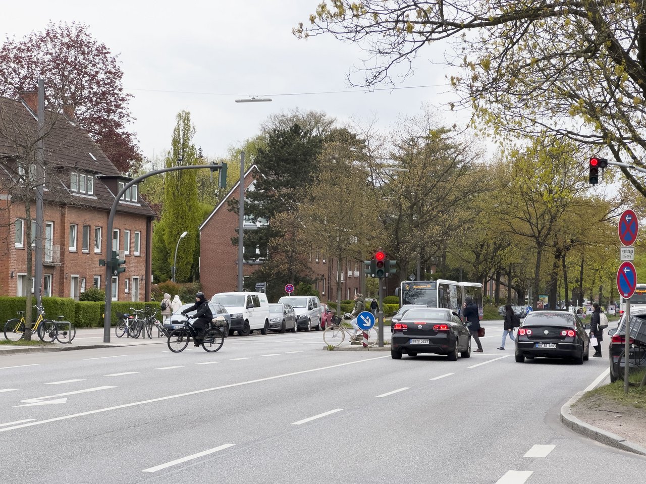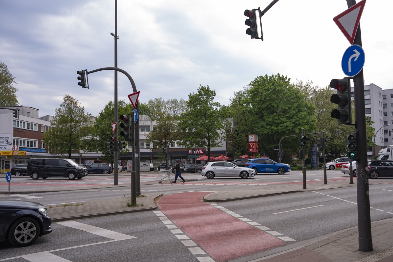Die Kreuzung Kieler Straße / Volksparkstraße / Sportplatzring ist für Fußgänger, insbesondere für Menschen mit Einschränkungen schwer passierbar.