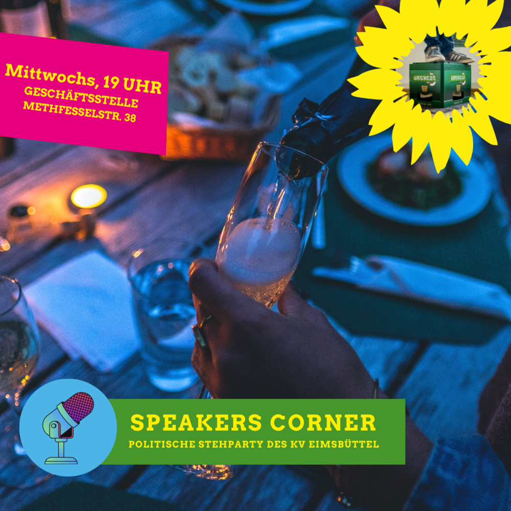Speakers Corner ist das wöchentliche Angebot der GRÜNEN Eimsbüttel. Es bietet allen Mitgliedern und Interessierten die Möglichkeit, sich kennenzulernen, zu vernetzen und anregende Gespräche zu führen. Bei Musik, Snacks, Wein, Wasser und Bier treffen sich politisch interessierte Menschen aus dem Bezirk Eimsbüttel, um über alltägliche Dinge zu sprechen und Spaß zu haben. Bei dieser Veranstaltung mit Stehparty-Charakter laden wir regelmäßig Gäste ein, die auf einer Bierkiste stehend kurz über ein Thema referieren und Fragen beantworten.
