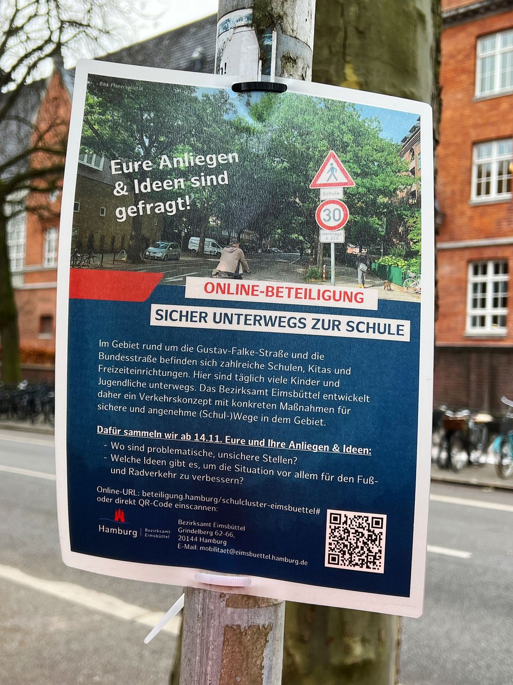 Nur noch bis zum 31. Januar 2023 läuft die – auf eine Initiative der GRÜNEN-Bezirksfraktion aus 2021 zurückgehende (Drucksachen-Nr. 21-2426) – Online-Umfrage zur Erarbeitung des Verkehrskonzeptes und konkreter Maßnahmen für sichere und angenehme (Schul-)Wege im Bereich Gustav-Falke-Straße/Bundesstraße.