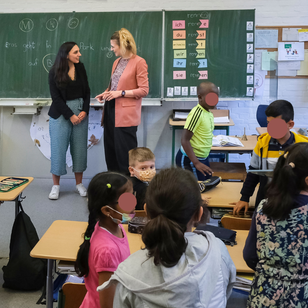 Gemeinsam mit Regina Marek (GRÜNE-Fraktion Harburg) besuchte die Eimsbüttler Bürgerschaftsabgeordnete und Vorsitzende des Schulausschusses Sina Aylin Demirhan im Mai die Georg-Kerschensteiner-Grundschule in Harburg. Die Schule ist seit 2017 Teil des Förderprogramms „D23+ Starke Schulen", von dem mittlerweile 40 Schulen in sozial herausfordernden Stadtgebieten profitieren.