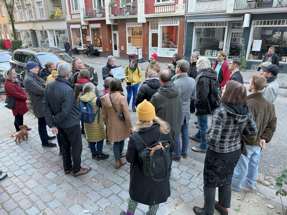 Im Komponistenquartier stimmten wir gemeinsam das Lied „An de Eck steiht’n Jung mit’n Tüdelband“ der Gebrüder Wolf an. Die jüdische Musikerfamilie Wolf, die sich wegen zunehmenden Antisemitismus‘ „Wolf-Trio“ nannte, trat seit 1895 in Hamburg auf und ist ein Symbol für die kulturelle Bedeutung jüdischen Lebens in Hamburg.