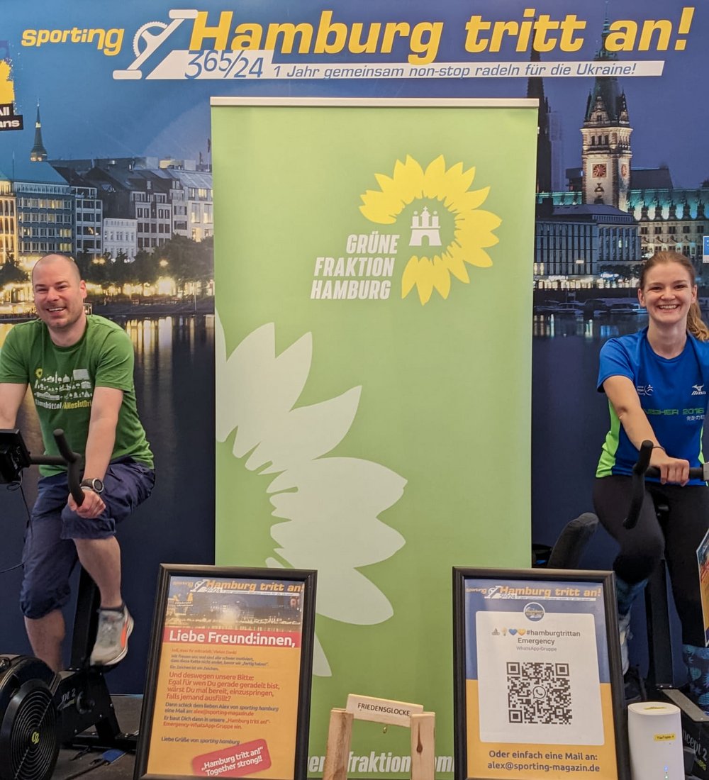 Am 15. und 16.06. haben wir Grüne dieses tolle Anliegen unterstützt und abwechselnd für den guten Zweck gestrampelt. Aus unserem Bezirk Eimsbüttel waren Jan und Jens dabei. Jan: "Ich habe um 7:00 die Sportklamotten übergeworfen und in einer noch sehr leeren Europapassage das Bike von meiner Vorradlerin übernommen. Bis 9:00 bin ich mit toller Begleitung (Isabel Permien aus dem Bezirk Nord) 'gefahren'. Es hat einfach Spaß gemacht, auf diese Weise ein Zeichen der Solidarität für die Menschen in der Ukraine zu setzen".