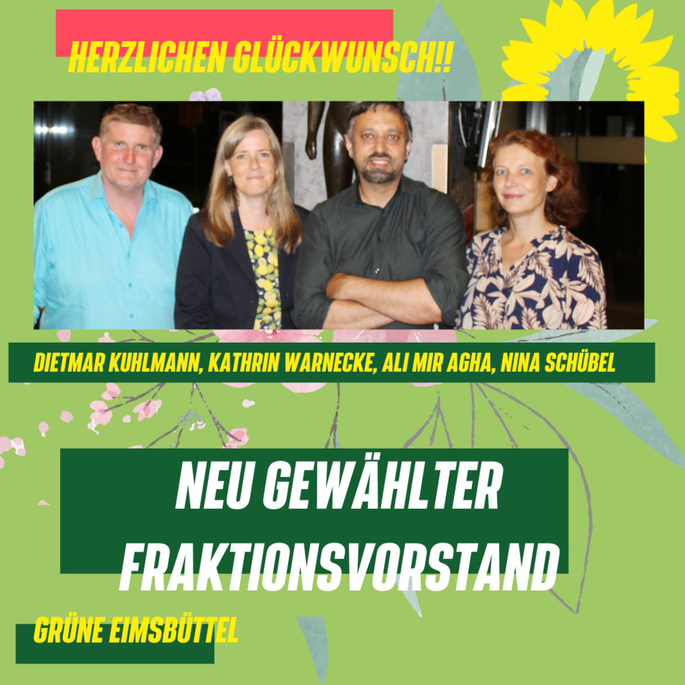 Die GRÜNE Bezirksfraktion hat auf ihrer Fraktionssitzung am vergangenen Donnerstag die bisherigen Vorstandsmitglieder für die 19-köpfige Fraktion einstimmig bestätigt. Kathrin Warnecke bildet weiterhin gemeinsam mit Ali Mir Agha eine Doppelspitze. Die stellvertretenden Vorsitzenden Nina Joana Schübel und Dietmar Kuhlmann wurden ebenfalls in ihrem Amt bestätigt.
