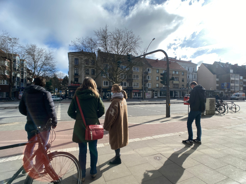 Zwölf Sekunden - so kurz ist hier die grüne Ampelphase für Fußgänger - reichen für mobilitätseingeschränkte Menschen zur Querung der sechsspurigen Grindelallee / Sedanstrasse kaum aus. Das war der einhellige Tenor von Falk Schmidt-Tobler, Kathrin Warnecke und Robert Klein, Mitglieder der Fraktion GRÜNE Eimsbüttel, bei einem Ortstermin. Mit einer Anwohnerin sprachen sie über die Schwierigkeit für Fußgänger*innen, insbesondere für Bewohner*innen aus einer nahegelegen Servicewohnanlage, die Straßen rund um die Monetastrasse zu überqueren.