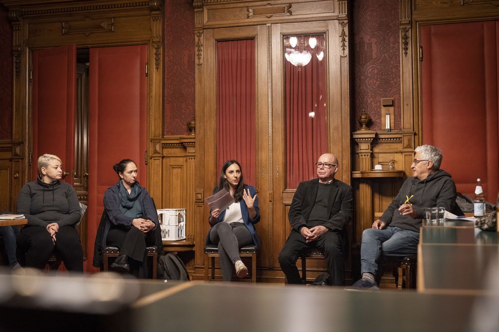 Unter dem Titel „Eine Bewegung in Waffen“ drehte sich alles um die ideologische und militante Vorarbeit, die die Hamburger Neonazis der 1980er und 1990er Jahre für die terroristischen Morde des NSU geleistet haben. Dr. Harry Waibel ist Historiker und Experte für Neonazismus, Rechtsextremismus und Antisemitismus in der DDR sowie Rassismus in Deutschland von 1945 bis zur Gegenwart. Er gab eine interessante und umfassende Einordnung, ergänzt von Gürsel Yıldırım aus der Perspektive der Initiative zum Gedenken an Ramazan Avcı, der 1985 von Hamburger Neonazis ermordet wurde. Vervollständigt wurde das Podium von Caro Keller, die zusammen mit dem bundesweiten antifaschistischen Bündnis NSU-Watch den Prozess gegen die NSU-Terrorgruppe begleitet hat und unter anderem über Parlamentarische Untersuchungsausschüsse und die rechte Szene im Allgemeinen berichtet. Mit dabei war auch die grüne Fraktionsvorsitzende Jennifer Jasberg, die darstellte, wie die Diskussion zu diesen Themen in der Hamburger Politik läuft und wo politische Handlungsfelder bestehen. Natürlich kam dabei auch erneut die Frage nach einem NSU-Untersuchungsausschuss auf, die zusammen mit den rund 40 Teilnehmer*innen intensiv diskutiert wurde.