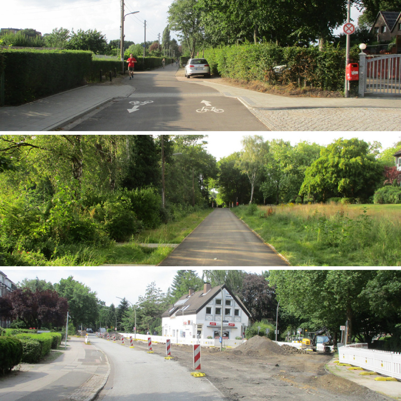 An der Pinneberger Chaussee in Eidelstedt, das ist der zweite Bereich, scheint das noch in weiter Ferne zu sein. Vorerst dominiert auch dort die Baustelle (siehe Foto 3). Die Busse der Linie 4 quälen sich durch Nebenstraßen und kein Tag vergeht, an dem sich nicht einer an einer Ecke festfährt. Fuß- und Radverkehr müssen sich mit schmalen Restflächen und Umwegen an den zugestellten Kreuzungen begnügen. Aber das Ziel lohnt, denn auch hier geht es um den Ausbau einer Veloroute: die Nummer 14 - bisher weitgehend unbekannt, weil nicht umgesetzt - soll als großer Ring die Außengebiete wie Lurup, Eidelstedt, Schnelsen, Niendorf bis nach Poppenbüttel und Berne verbinden. Und hier, an der Pinneberger Chaussee, besteht ein kleiner, aber netter Weg zwischen den Häusern und entlang eines Regenrückhaltebeckens, der allen Eidelstedter*innen neue komfortable Möglichkeiten abseits des Kfz-Verkehrs eröffnet und den Stadtteil ein kleines Stückchen radfreundlicher macht. Und damit es noch mehr davon gibt, hat eine Aktivengruppe namens Umweltschnack für den 4. September eine Fahrraddemo angemeldet. Da sollten wir GRÜNE nicht fehlen. Also, auf nach Eidelstedt!
