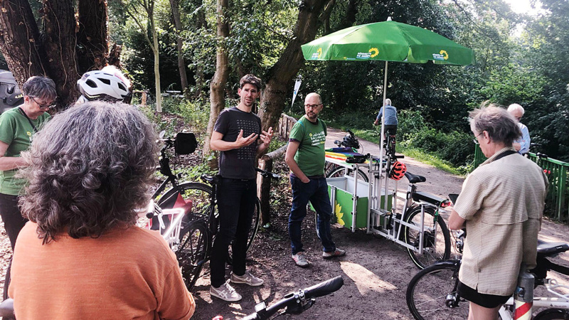 Mit der „Hummel“ kommt unser Spitzenkandidat Dr. Till Steffen zum Ausgangspunkt seiner Tour #5. Das grüne Lastenrad des Kreisverbands, bedeckt mit der CSD-Fahne und voller Wahlkampfmaterial ist erst vor einer Woche auf der Kreismitgliederversammlung getauft worden und bereits voll im Einsatz.