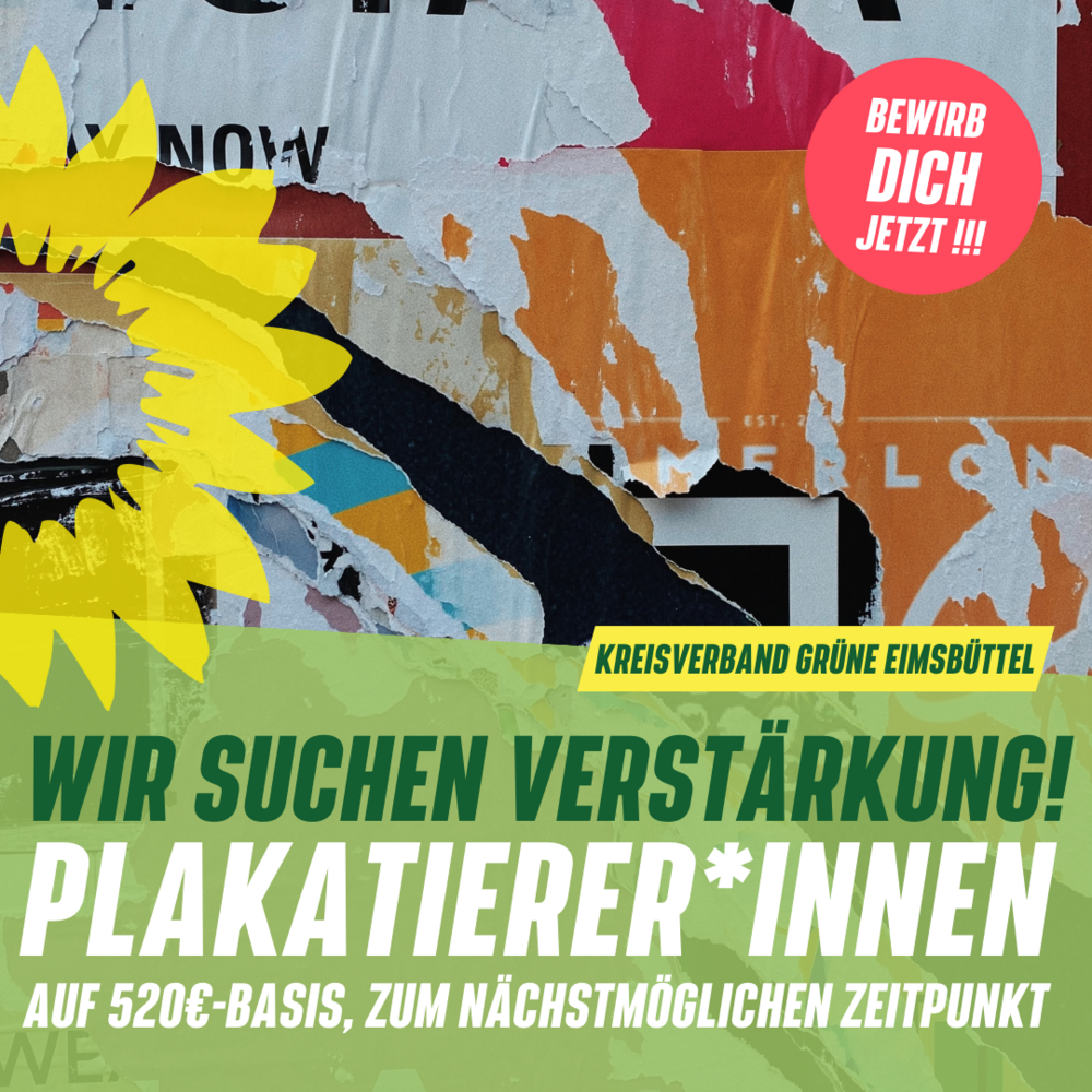 Die Plakatierungen finden grundlegend im 2-wöchentlichen Rhythmus statt. Die genauen Arbeitszeiten können flexibel abgestimmt werden. Idealerweise bist du volljährig und besitzt du einen Führerschein - dies ist allerdings kein Muss! Bei Interesse und Rückfragen melde dich gerne bei uns - per Mail unter kreisverband@gruene-eimsbuettel oder telefonisch unter 0404014245. Wir freuen uns auf dich!