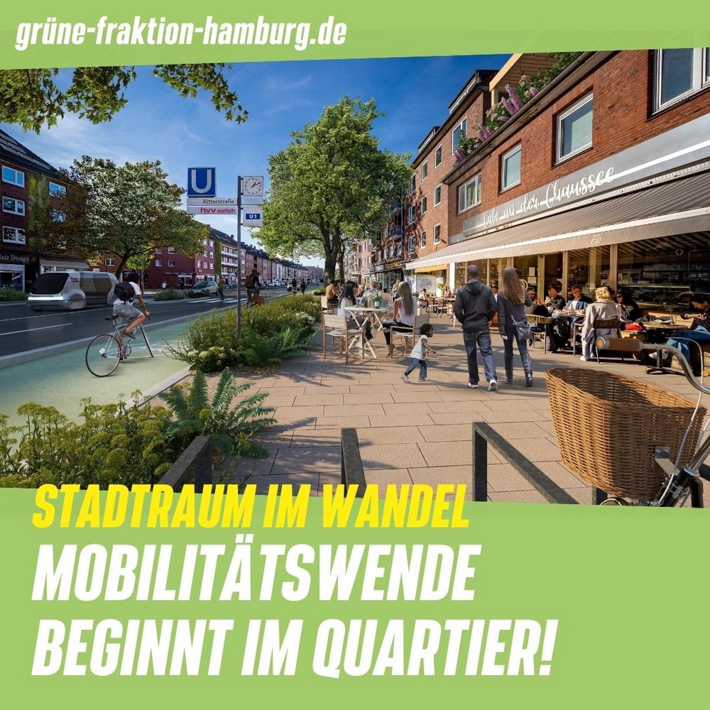 Am 14. Juni hatte das Projekt Superbüttel einen prominenten Auftritt! Bei der Veranstaltung „Mobilitätswende beginnt im Quartier“ unserer Grünen Bürgerschaftsfraktion stellte Christine Stecker, Mitinitiatorin von Superbüttel, die Idee vor, wie ein Teil Eimsbüttels nach dem Beispiel der Superblocks aus Barcelona umgestaltet werden könnte: Im südlichen Bereich zwischen Kieler Straße und Lappenbergsallee könnten mit weniger Parkplätzen, mehr Grün und mehr Sitzgelegenheiten neue Begegnungsräume für die Nachbarschaft entstehen. Die Initiative Kurs Fahrradstadt hat 2021 ein Konzept entwickelt, wie der Straßenraum im Quartier zum Aufenthaltsraum werden kann – dabei trägt es mit weniger Autos und mehr Platz für Rad- und Fußverkehr auch zur Mobilitätswende bei. Gemeinsam mit Rosa Domm, Sprecherin für Mobilitätswende, hatte ich zu der Veranstaltung ins Rathaus eingeladen. Mit Christine Stecker, dem Verkehrsexperten Christian Scheler (Good Mobility Council) und dem Publikum berieten wir darüber, welche Interventionen wir - abseits von Radwegen und dem Ausbau des ÖPNV –in unseren Quartieren brauchen, um den Anteil am Umweltverbund weiter zu erhöhen. Die Bilder von Superbüttel zeigen eindrucksvoll, wie die Zukunft unserer Quartiere aussehen sollte. Wir brauchen grünere und verkehrsberuhigte Straßenräume, die Kindern sicheres Spielen ermöglichen und älteren Menschen Sitzgelegenheiten im Schatten bieten. Wir müssen die Stadt noch viel stärker aus der Perspektive des Menschen betrachten – die autogerechte Stadt ist passé. Daher haben wir als Bürgerschaftsfraktion im vergangenen Jahr ein Konzept und Visualisierungen für die Zukunft des Hamburger Stadtraums vorgelegt. Wir werden kontinuierlich weiter zeigen, was unsere Stadtteile gewinnen können, wenn sie autoärmer und grüner werden!
