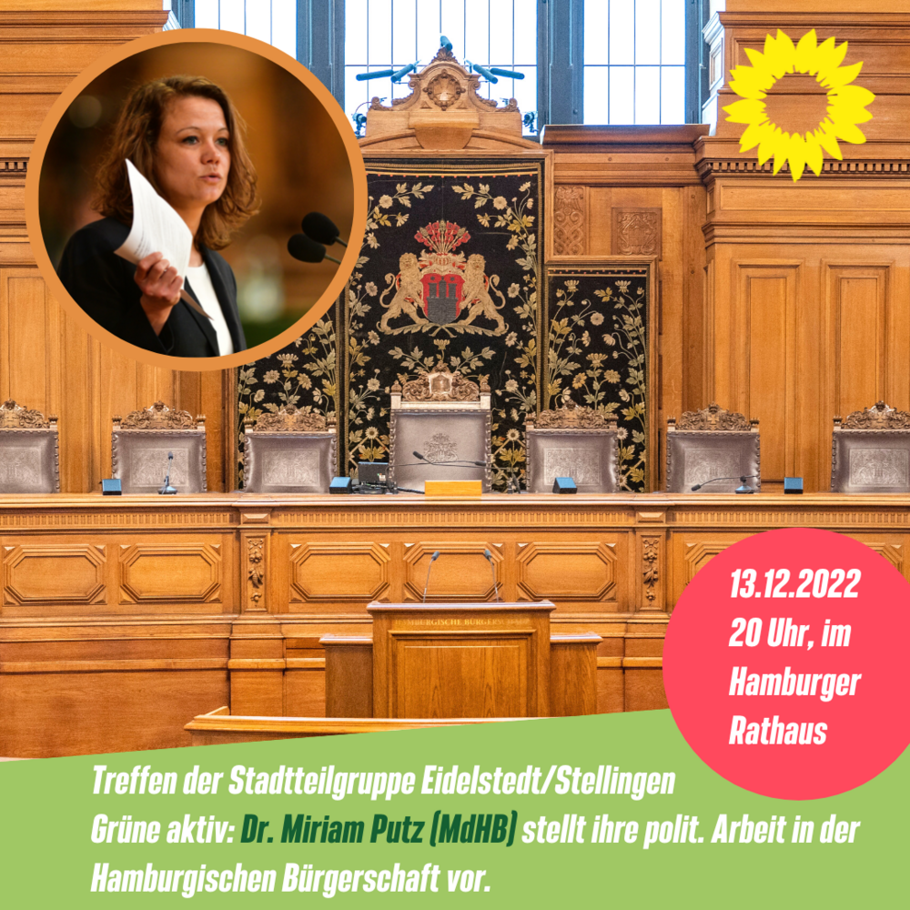 Miriam Putz, Eimsbüttlerin und Abgeordnete der Grünen Bürgerschaftsfraktion, lädt zum Treffen der Stadtteilgruppe Eidelstedt/Stellingen in Hamburger Rathaus. Sie ist Sprecherin für Wirtschaft, Tourismus, Flughafen und Hafen der GRÜNEN Fraktion und wird hier ihre politische Arbeit in der Bürgerschaft vorstellen.