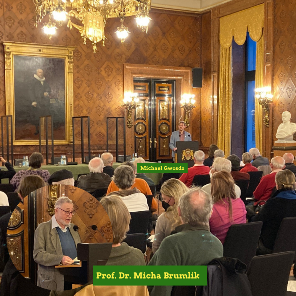 Rund 60 Gäste konnten sich nach coronabedingter Unterbrechung auf einen spannenden Abend im Kaisersaal des Hamburger Rathauses freuen, Michael Gwosdz, religionspolitischer Sprecher der Bürgerschaftsfraktion, moderierte den Abend. In seinem Vortrag „Was ist eigentlich jüdisch? Eine religionshistorische Betrachtung“ spannte Prof. Micha Brumlik, emeritierter Professor für Erziehungswissenschaften, Publizist und Träger der Buber-Rosenzweig Medaille, einen weiten Bogen von der deutschen Nachkriegsgeschichte bis zur Basis des Judentums, der Hebräischen Bibel.