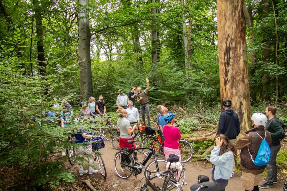 Auf geht’s mit den Rädern zum ersten Halt. Sven Wurster zeigt uns das erste „Waldbild“ und erklärt uns, warum Nadelgewächse, insbesondere die beliebten Fichten eigentlich in das Gebirge gehören, trotzdem vor über hundert Jahren hier angepflanzt wurden und nun mittelfristig keine Zukunft haben werden. Nicht nur die Dürre, sondern dazu die Stürme setzen den Flachwurzlern zu. Demgegenüber wachsen die Buchen beständig und die Dürre scheint ihnen bisher nichts anhaben zu können, obwohl auch dies beobachtet werden muss. Da Buchen schattenertragend sind, werden sie unter den Nadelbäumen angepflanzt um die Nachforstung zügig vorzunehmen. Übrigens: Die Kastanie wird in Hamburg keine Zukunft haben; sie leidet unter einem nicht zu bekämpfenden komplexen Befall.