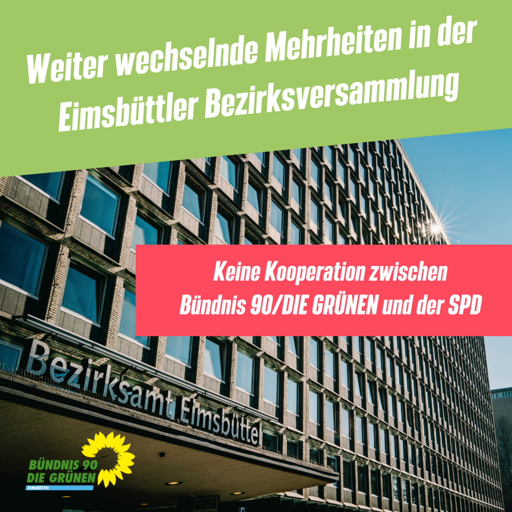Hamburg, 5.12.22 Bündnis 90/DIE GRÜNEN in Eimsbüttel werden in der Bezirksversammlung weiterhin auf wechselnde Mehrheiten setzen. Gespräche mit der SPD über eine engere inhaltliche Kooperation in den verbleibenden 16 Monaten der Legislatur haben zu keinem tragfähigen Ergebnis geführt.