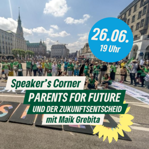 Maik Grebita wird die Parents For Future Hamburg und den Zukunftsentscheid vorstellen. Dieser soll den Senat zu einem sozial gerechten, wissenschaftsbasierten und wirtschaftlich ausgewogenen Klimaschutz verpflichten und der Klimapolitik einen verlässlichen Rahmen bieten.